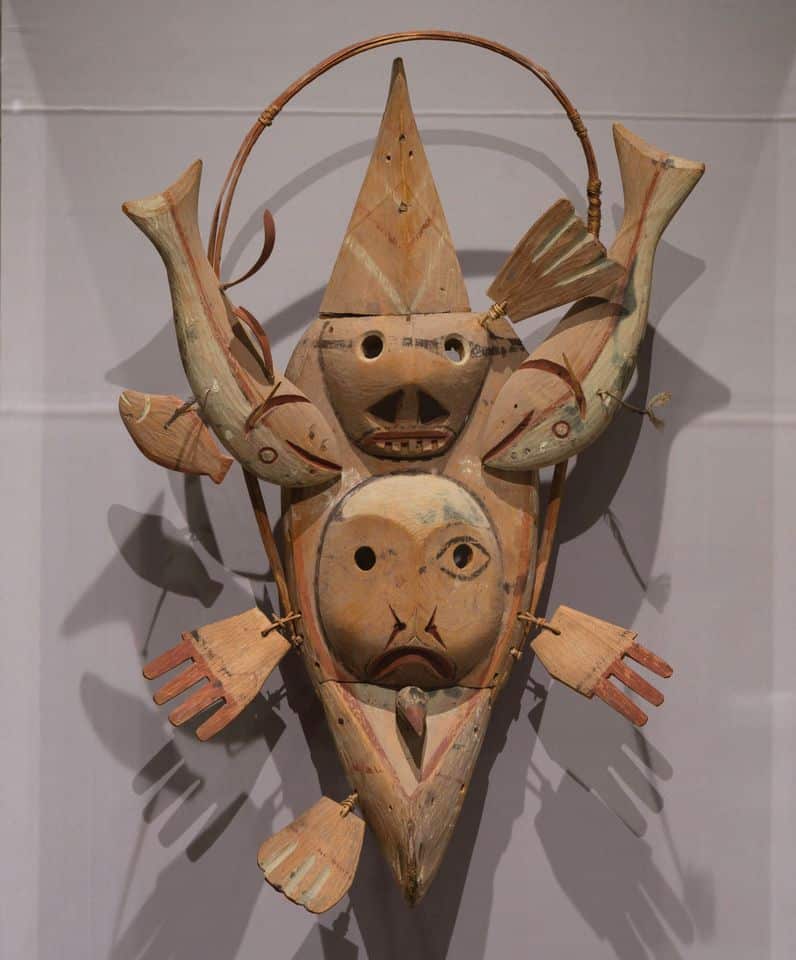 Carved from driftwood and measuring nearly 3ft in height, the mask depicts a kayak pierced by a seal and studded with a skull, a fish, a bird’s head, hands, flippers and feathers. Because the mask was too large to be worn during ceremonies, it would be suspended from the ceiling and then a Yup’ik dancer would approach it from the rear and bite on a protrusion to set it in motion.