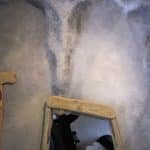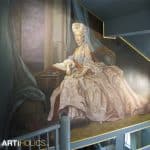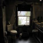 The bath tub / shower is right next to the bed, but the tiling and large rectangular semi-opaque frosted windows make it seem like part of the painting. Here Molly demonstrates it’s opacity.