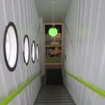 The lounge looks into the kitchen through these circular cubbyholes.