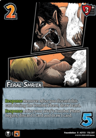 The Feral Shriek card features a dynamic and dramatic illustration of the clash between the Attack Titan and the Female Titan. The artwork beautifully captures the high-stakes battle, with both Titans locked in a fierce struggle.