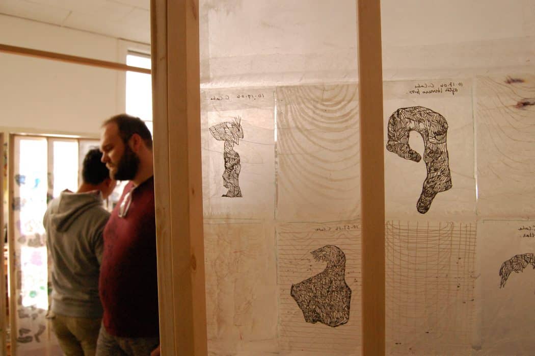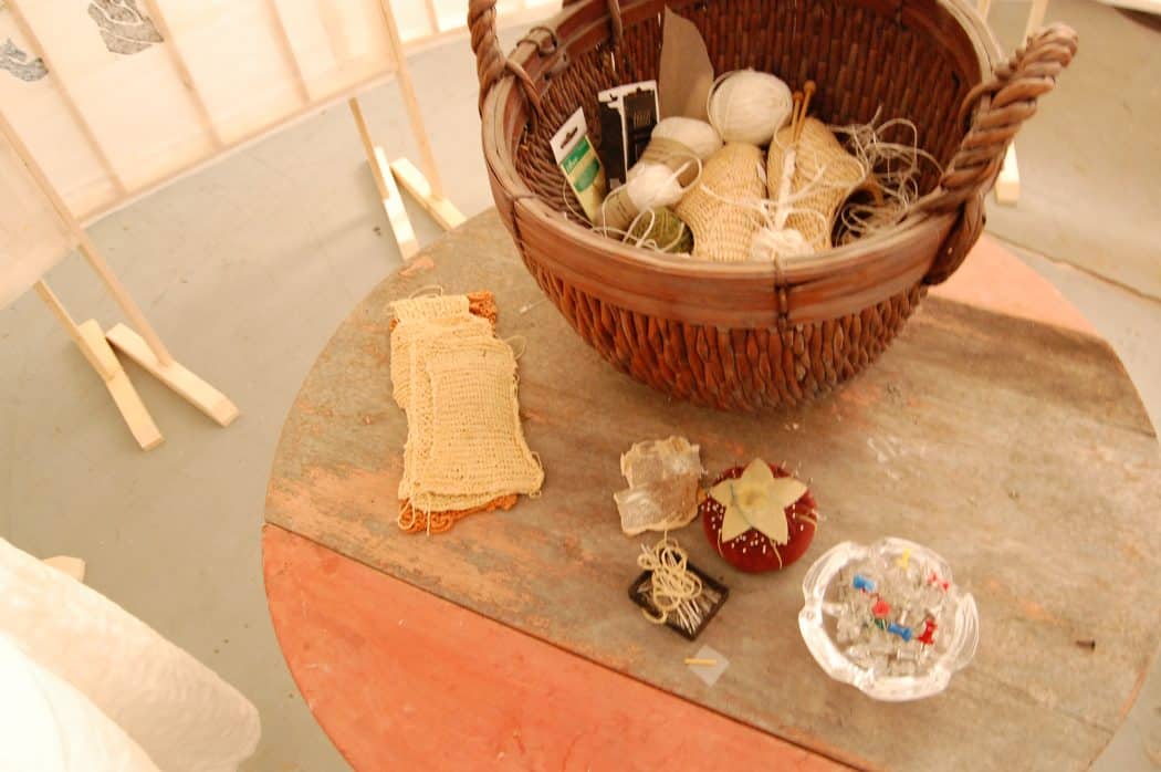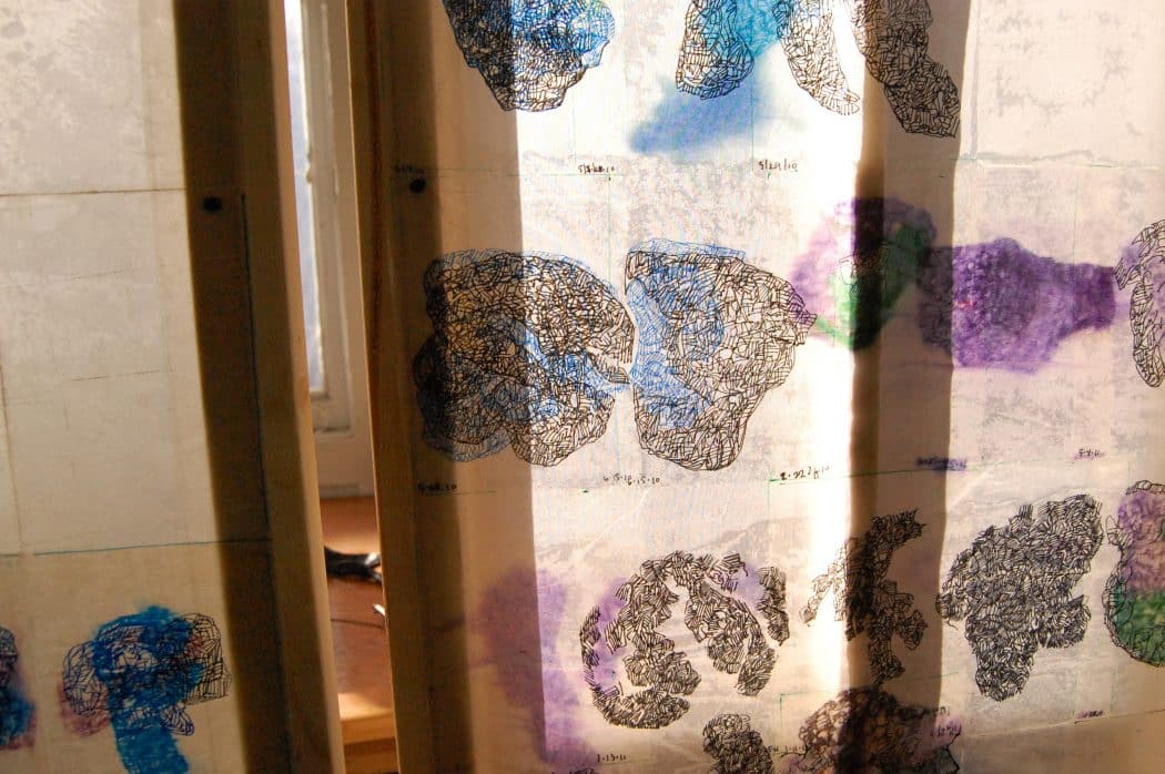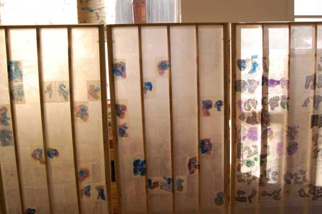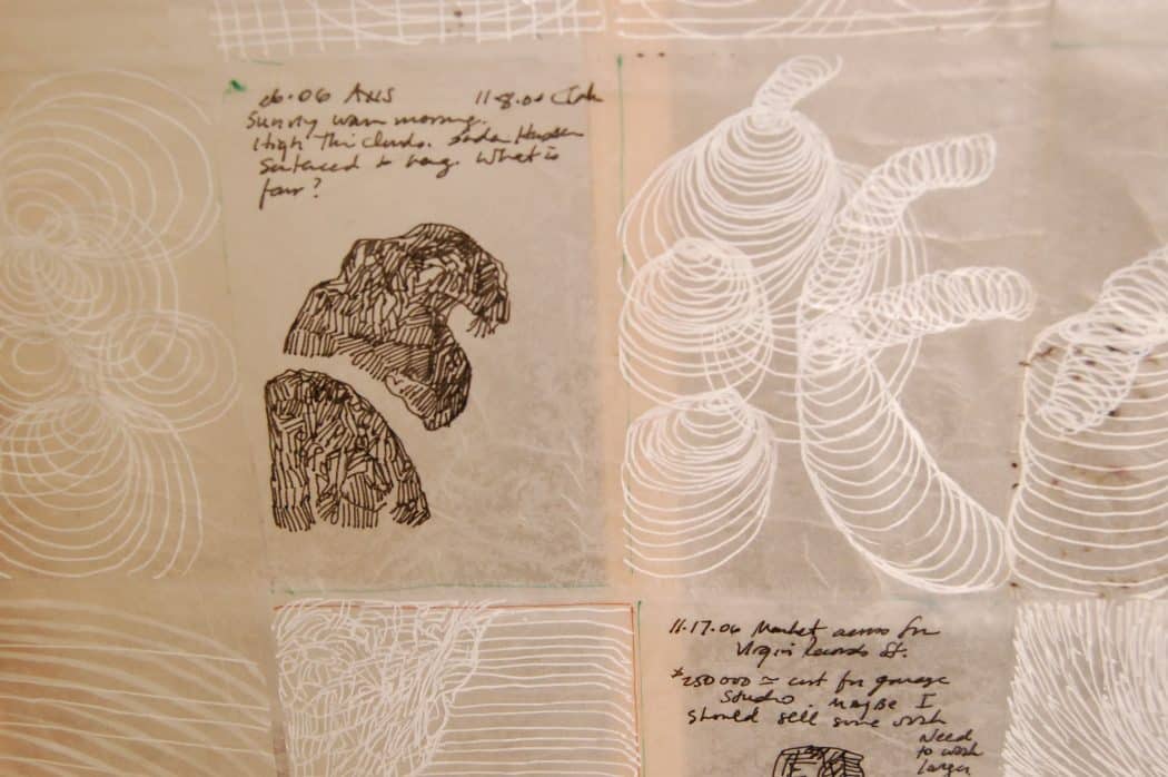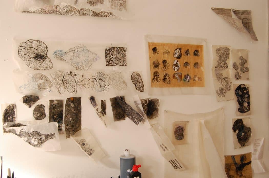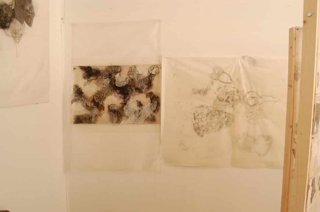 Drawings and sculptural works in the studio of Pamela Axelson.