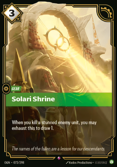 Solari Shrine makes you work for its rewards—but that’s exactly what makes it satisfying. This is a gear card that lets you exhaust it to draw a card, but only after you kill a stunned enemy unit.